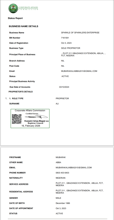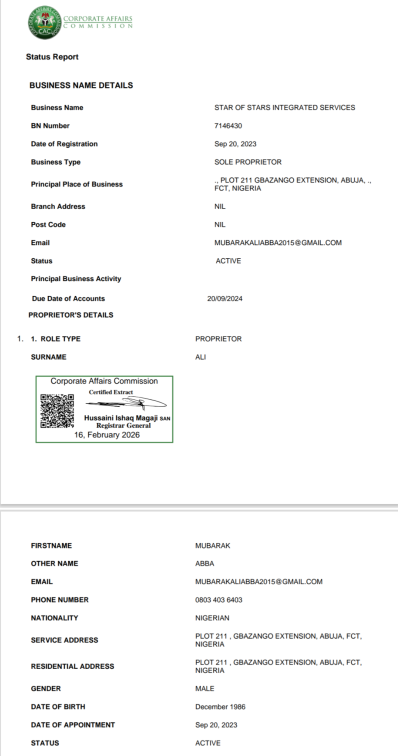 Documents reviewed by SaharaReporters indicate that Star of Stars Integrated Services (BN 7146430) was registered with the Corporate Affairs Commission on September 20, 2023, listing Ali Mubarak Abba as sole proprietor, less than a month before Ishaq Hussaini Magaji assumed office as Registrar-General on October 13, 2023.